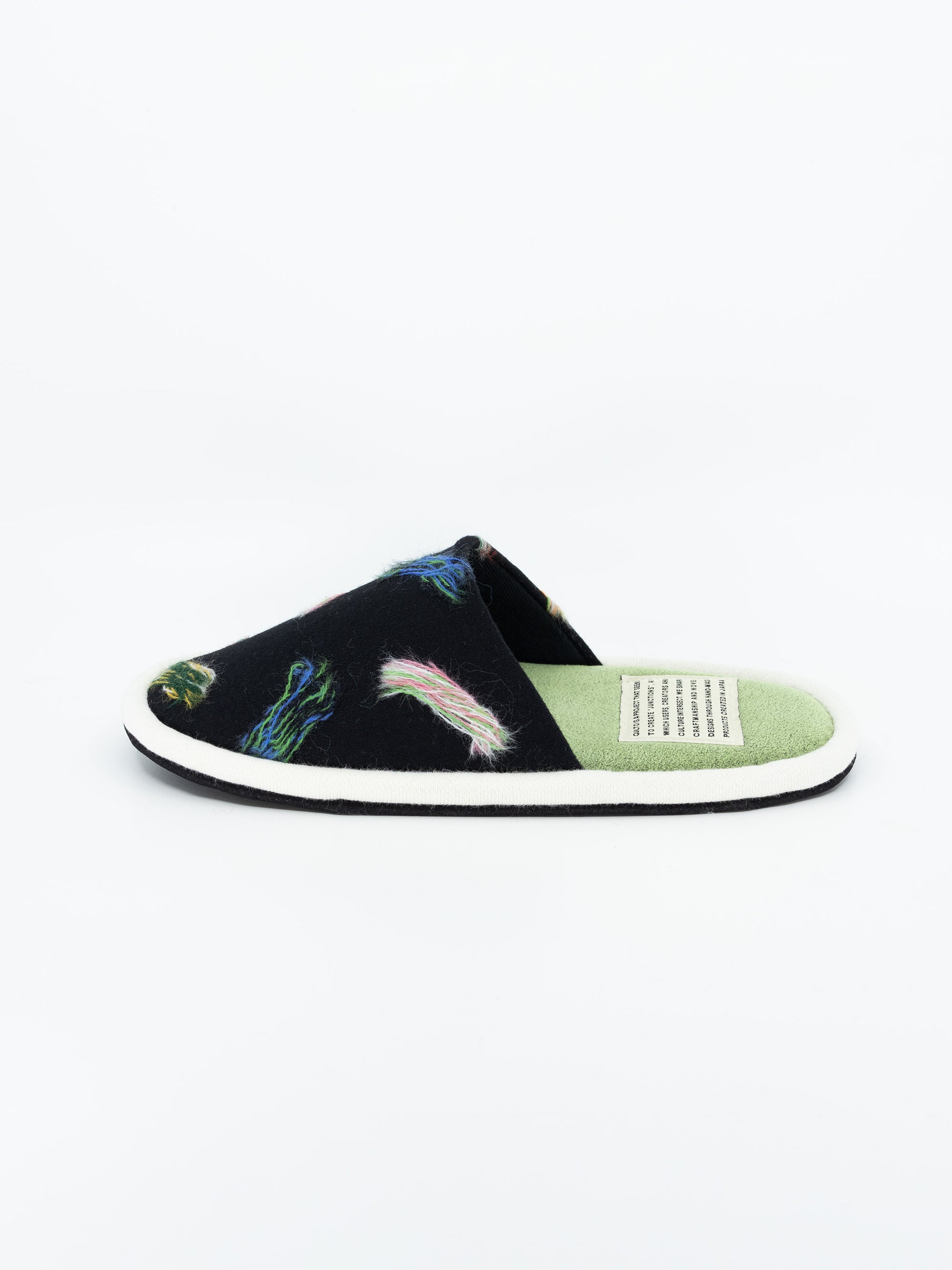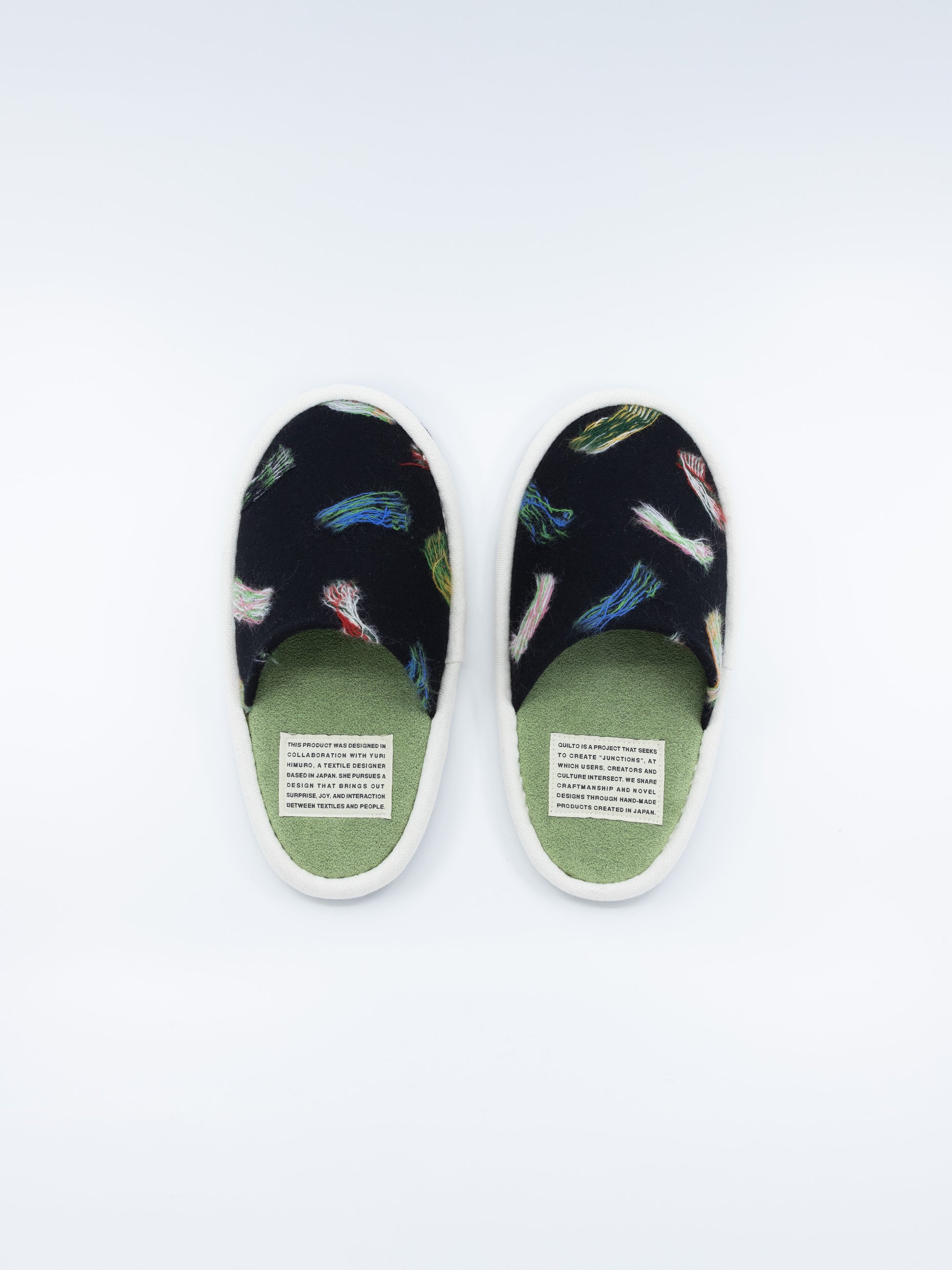 テキスタイルデザイナーYuri Himuroさんのテキスタイル、”LINT”をアッパーに使用した一足。 ”LINT”はアトリエで商品製作を進める過程で出る糸を収集し、糸屑一つ一つを生地に並べてパンチングして製作しています。 ブラックのシンプルな生地にカラフルな糸が映えるシンプルながらも遊び心溢れるデザインが魅力です。 スエード調で滑らかな肌触りの中敷部分はクッション性も◎。 裏面には滑りにくい素材を使用し、全て日本の工場で職人が手仕事で仕上げています。