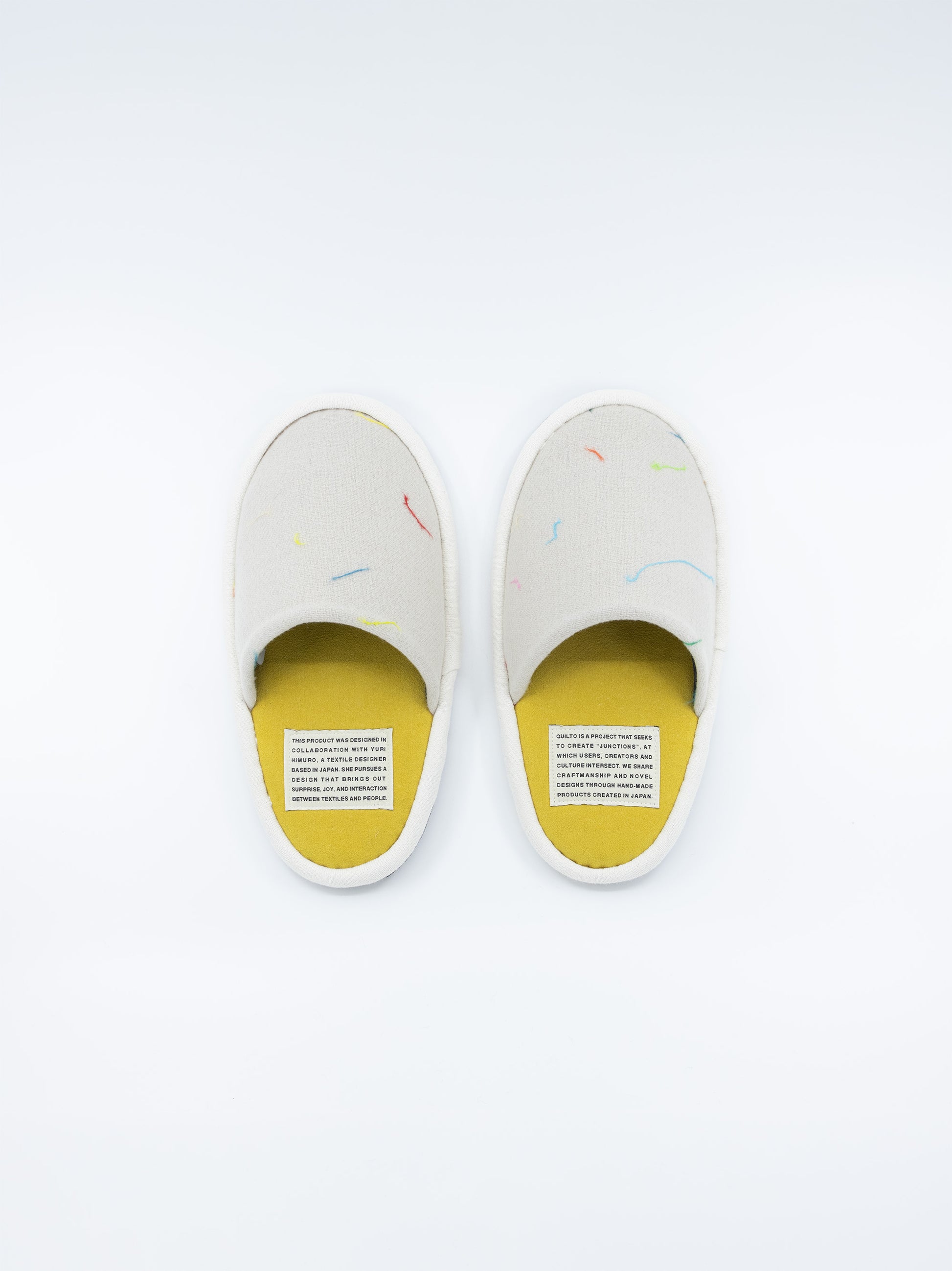 テキスタイルデザイナーYuri Himuroさんのテキスタイル、”LINT”をアッパーに使用した一足。 ”LINT”はアトリエで商品製作を進める過程で出る糸を収集し、糸屑一つ一つを生地に並べてパンチングして製作しています。 アイボリーのシンプルな生地にカラフルな糸が映える、シンプルながらも遊び心溢れるデザインが魅力です。 アクセントとなるイエローの中敷部分は程よいクッション性に加えて、スエード調で肌触りも滑らか。 裏面には滑りにくい素材を使用し、全て日本の工場で職人が手仕事で仕上げています。