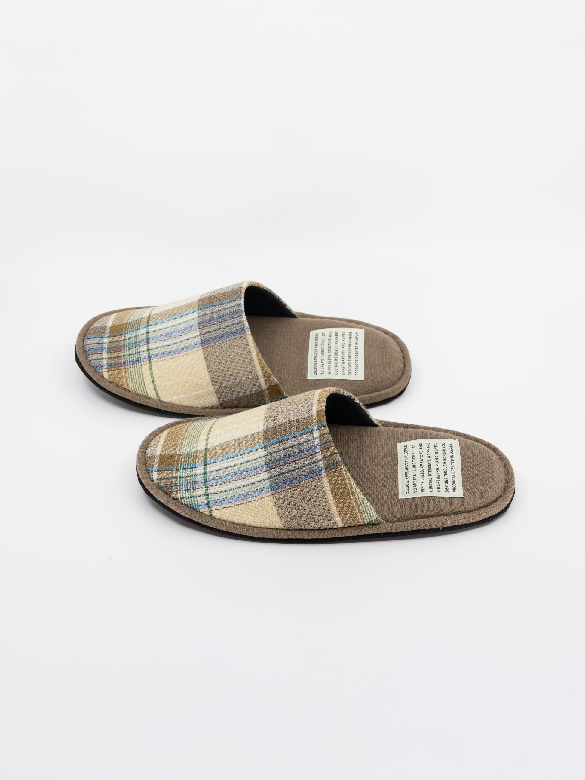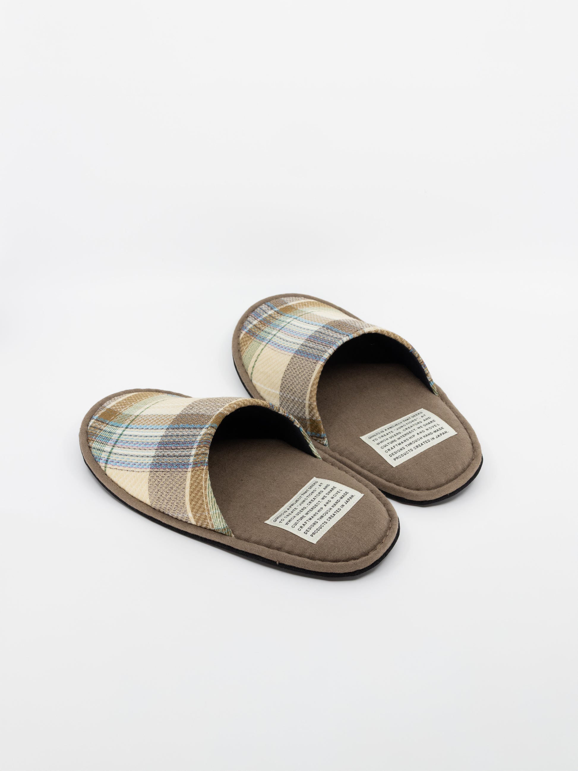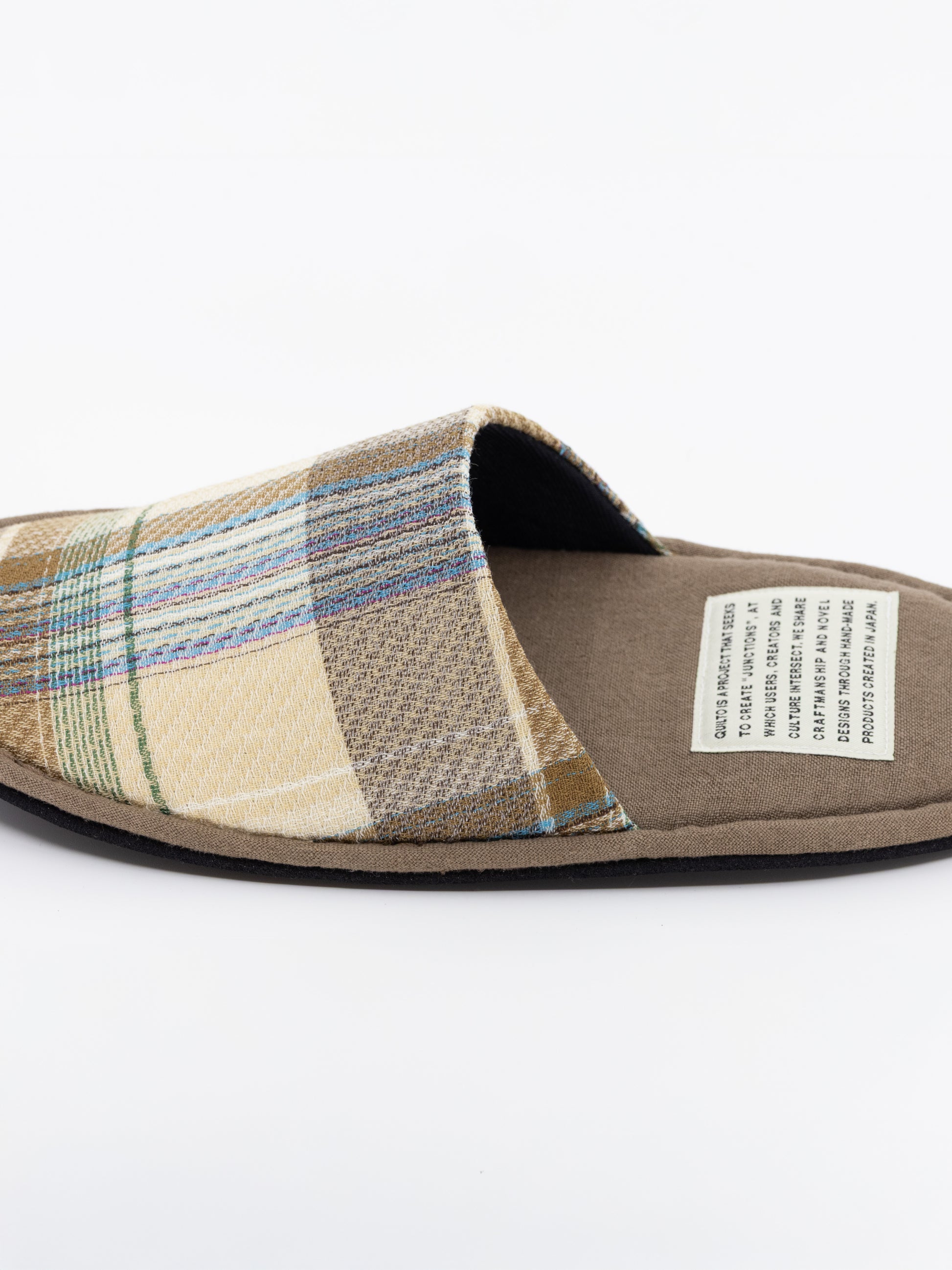希少なユーズドファブリックやファブリックアートを扱う、大阪の手芸屋<yuge fabric farm>とコラボレーションした一足。特徴的な配色のチェック生地に、ブラウンの麻の中敷きを合わせ、季節を問わず快適な履き心地に仕上げています。