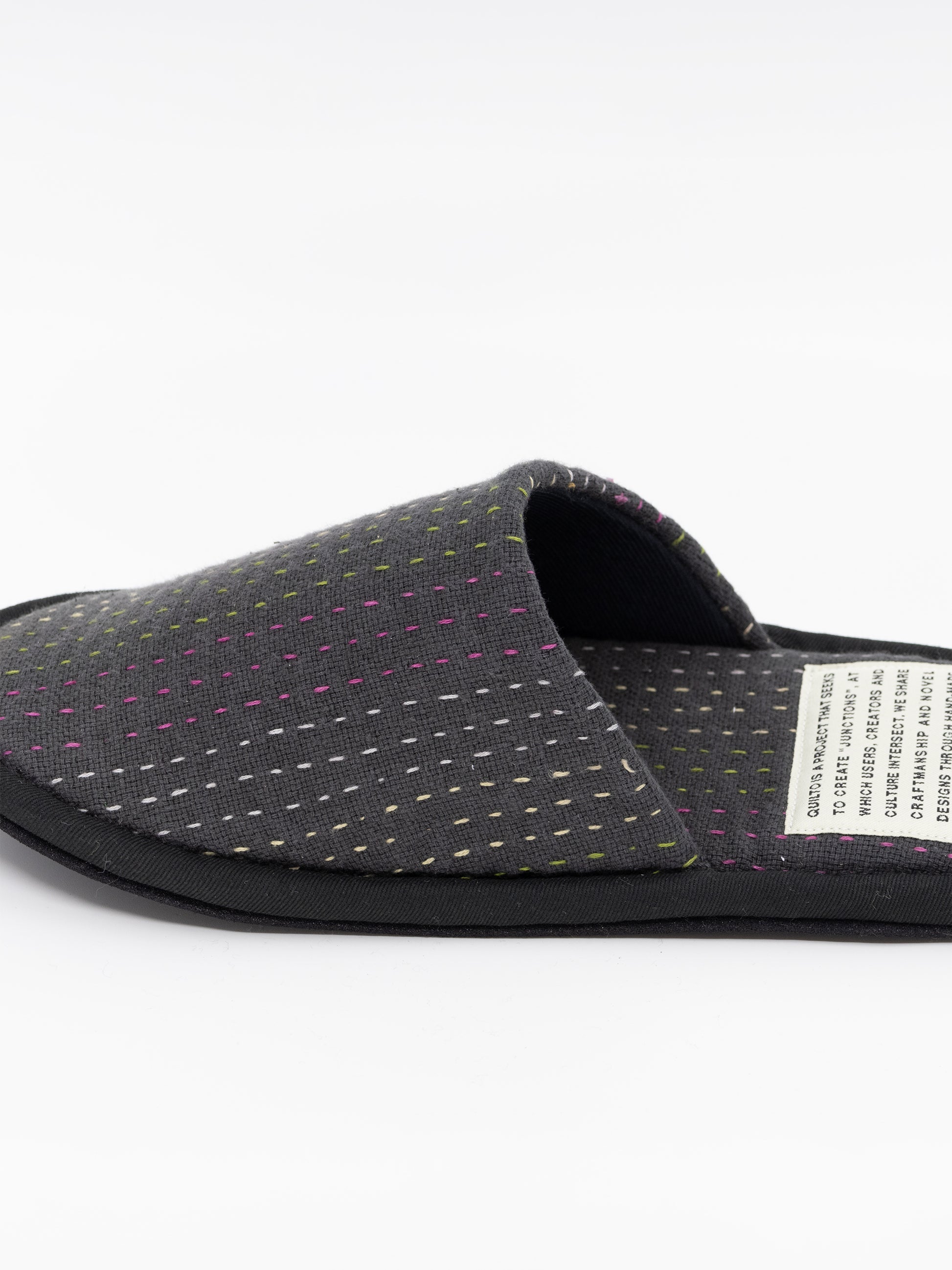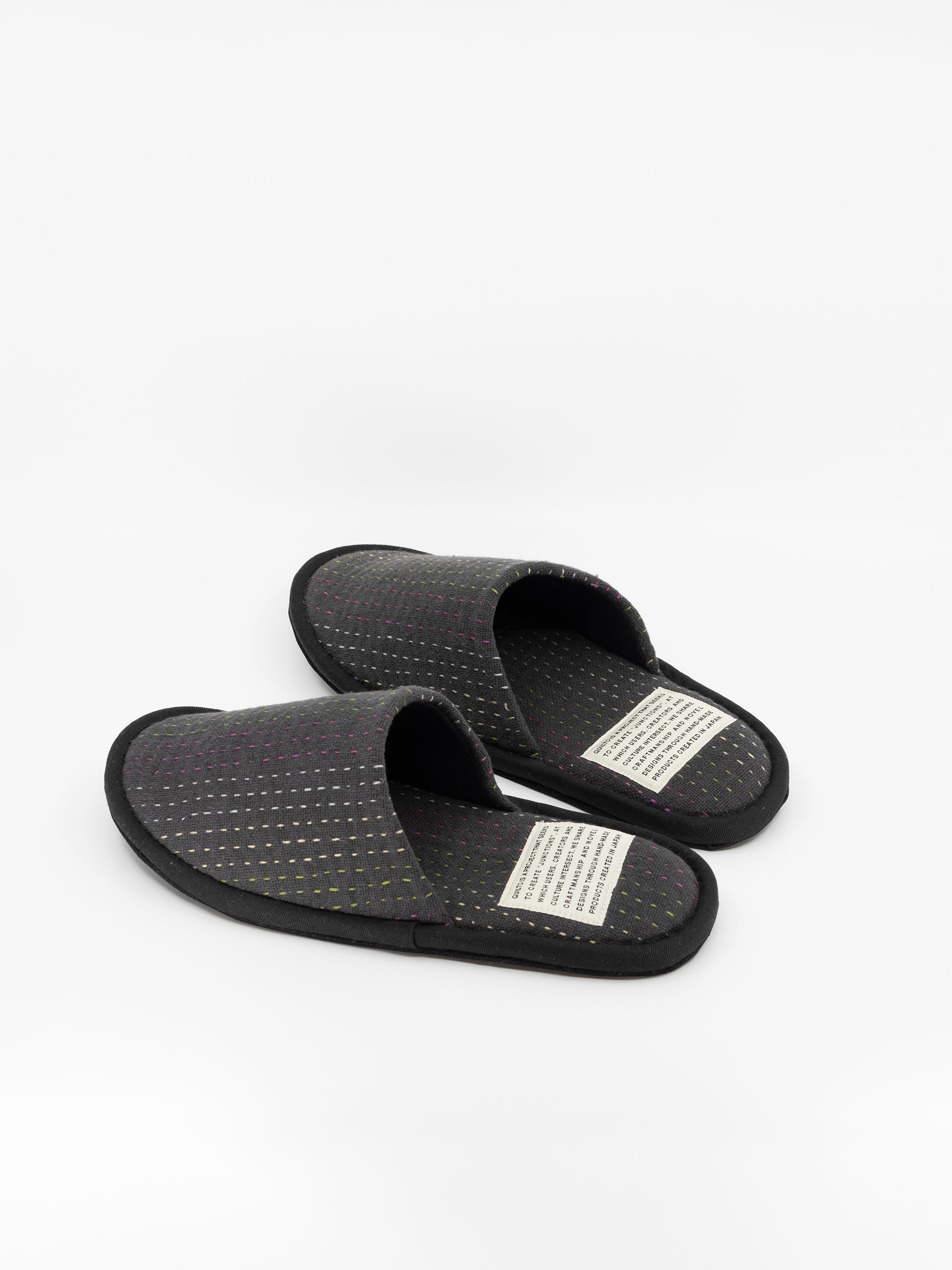 細かくカラフルな運針が魅力の刺子生地で制作した一足。