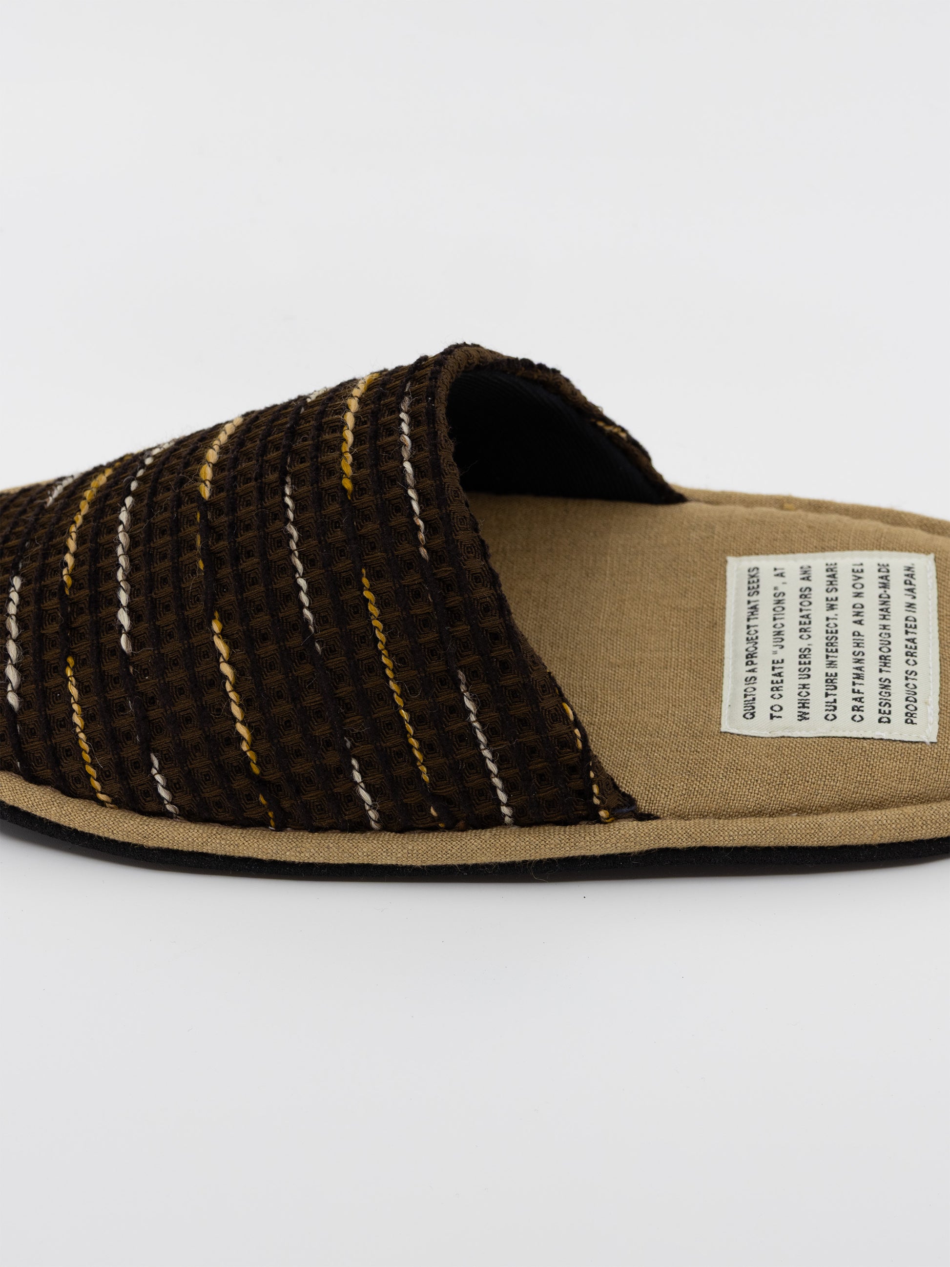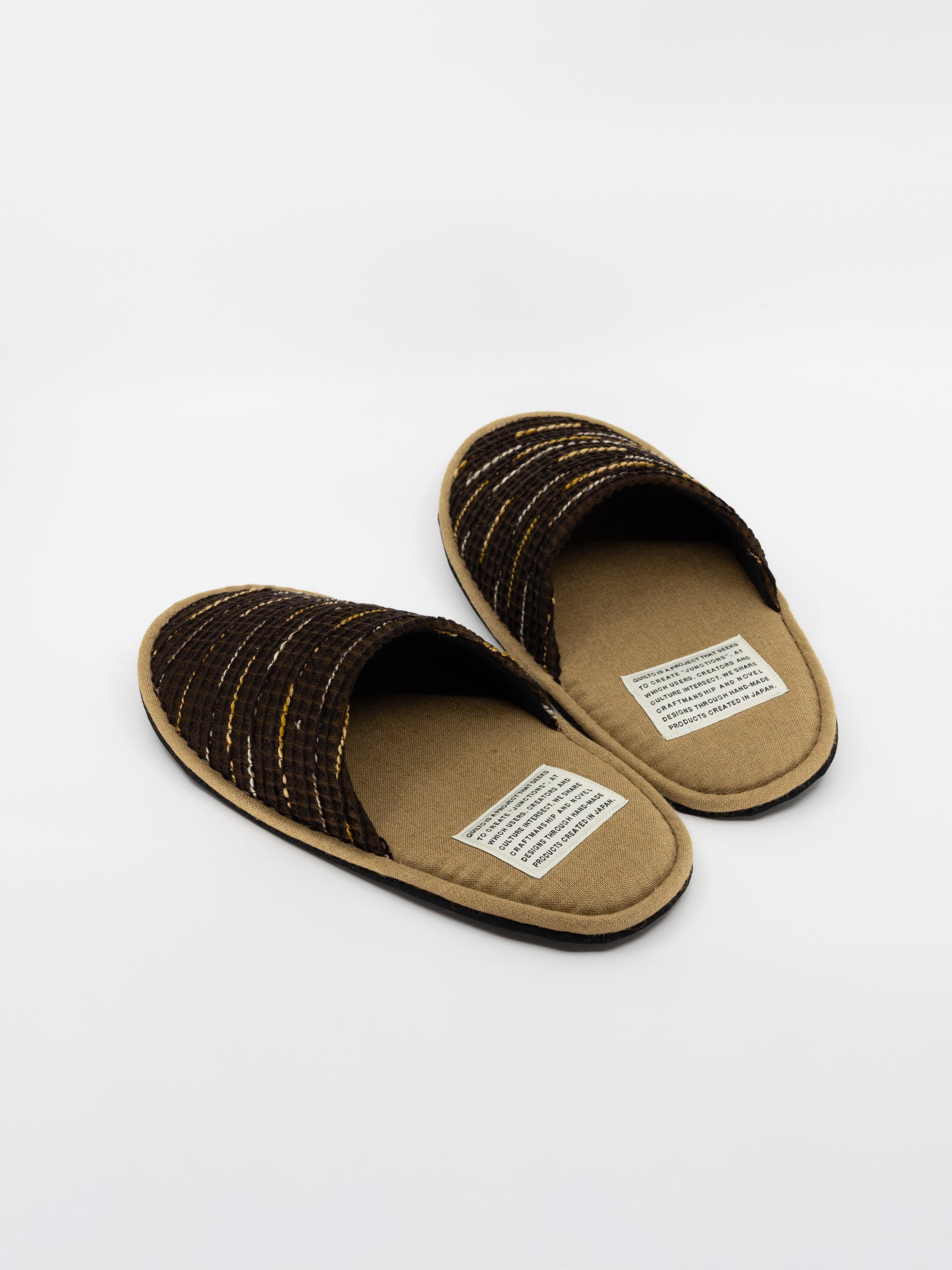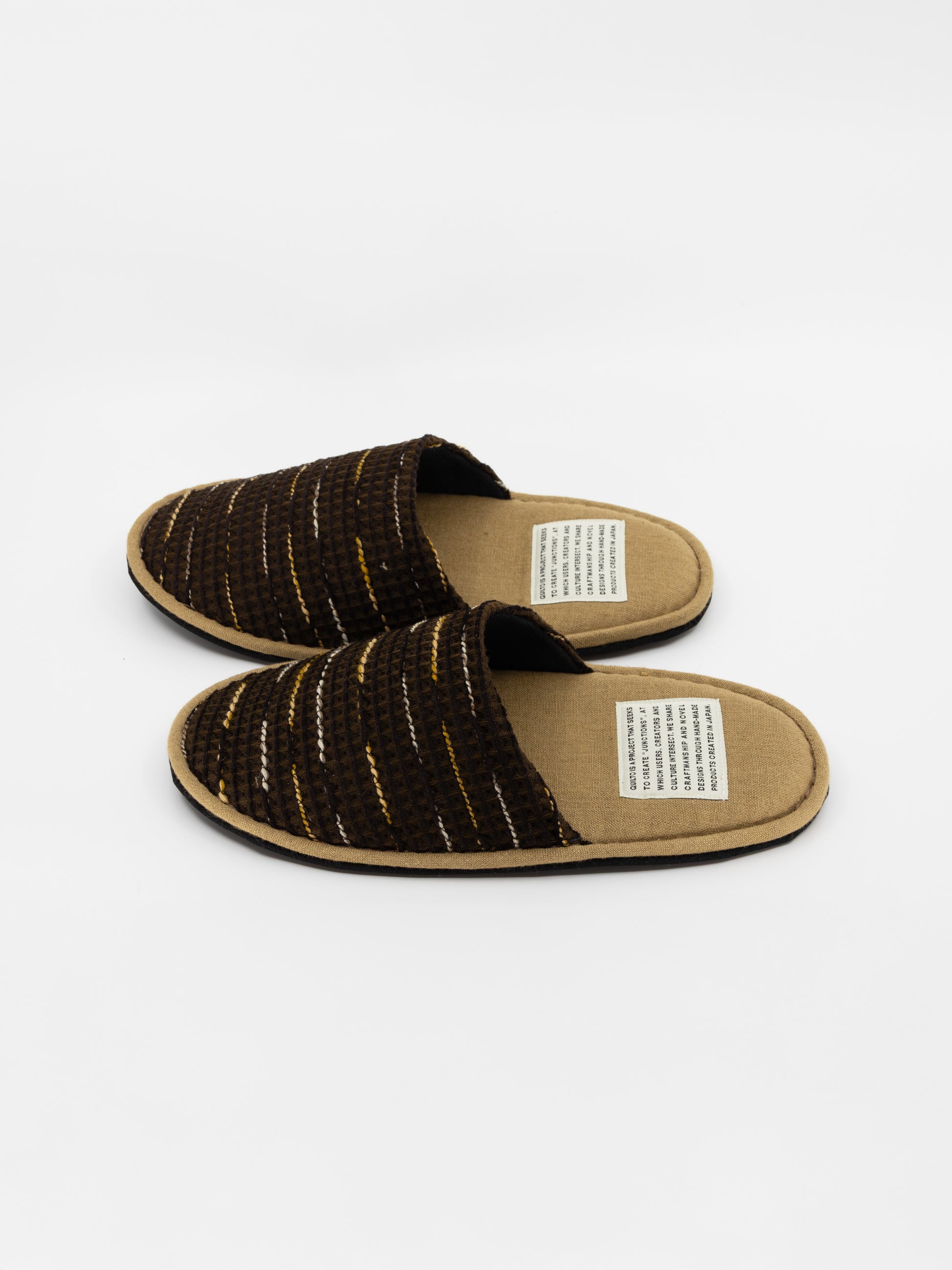希少なユーズドファブリックやファブリックアートを扱う、大阪の手芸屋<yuge fabric farm>とコラボレーションした一足。20〜30年前のインテリアファブリックのdead stockの柔らかなワッフル地に、麻の中敷きを合わせ、季節を問わず快適な履き心地に仕上げています。